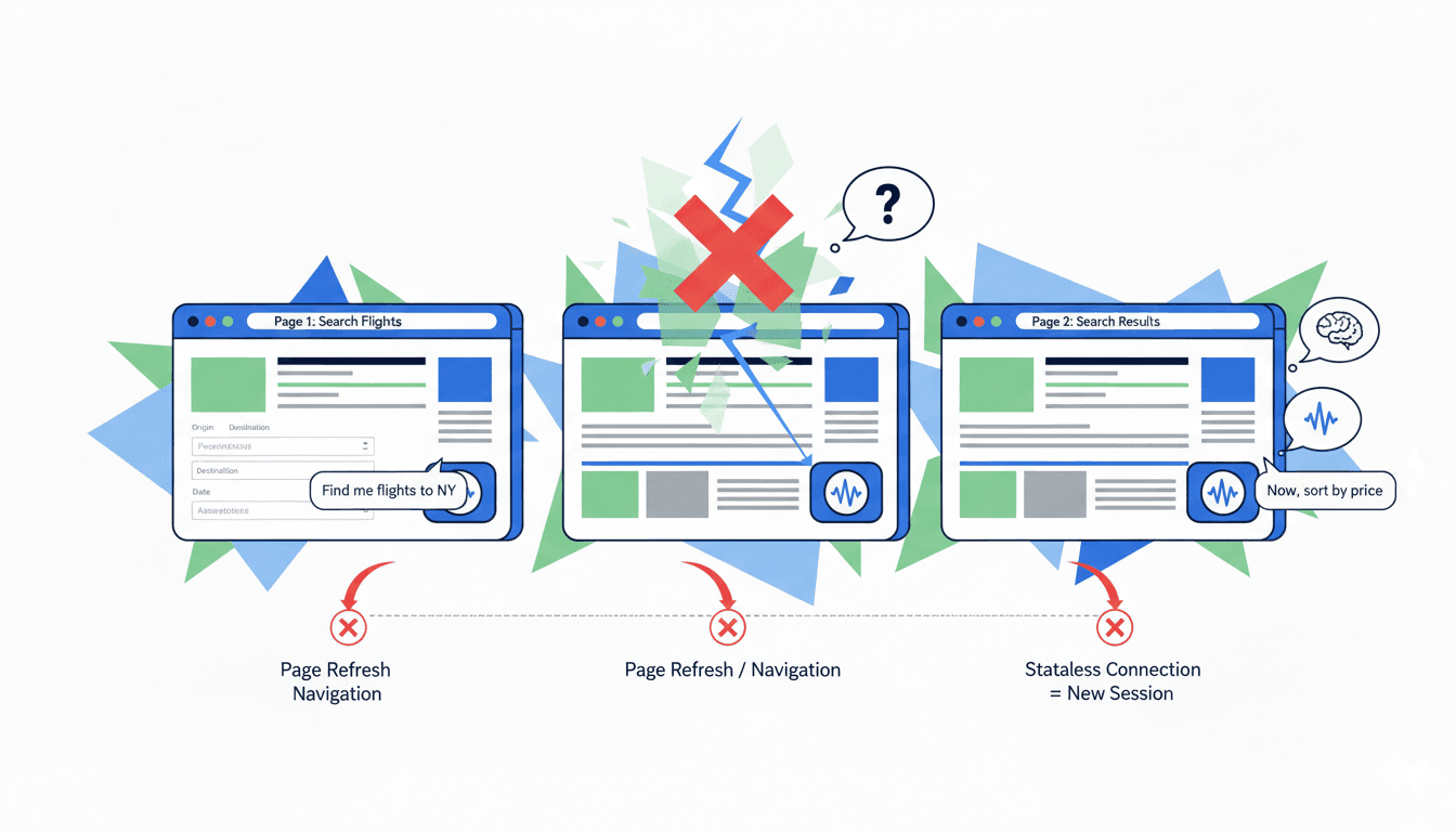 A major challenge for a voice agent implemented via direct script injection is its inability to maintain a continuous conversation as a user navigates a website. The standard behavior of a web browser is to treat each page load as a separate, isolated event. This model is fundamentally at odds with the requirements of a persistent, stateful AI assistant.